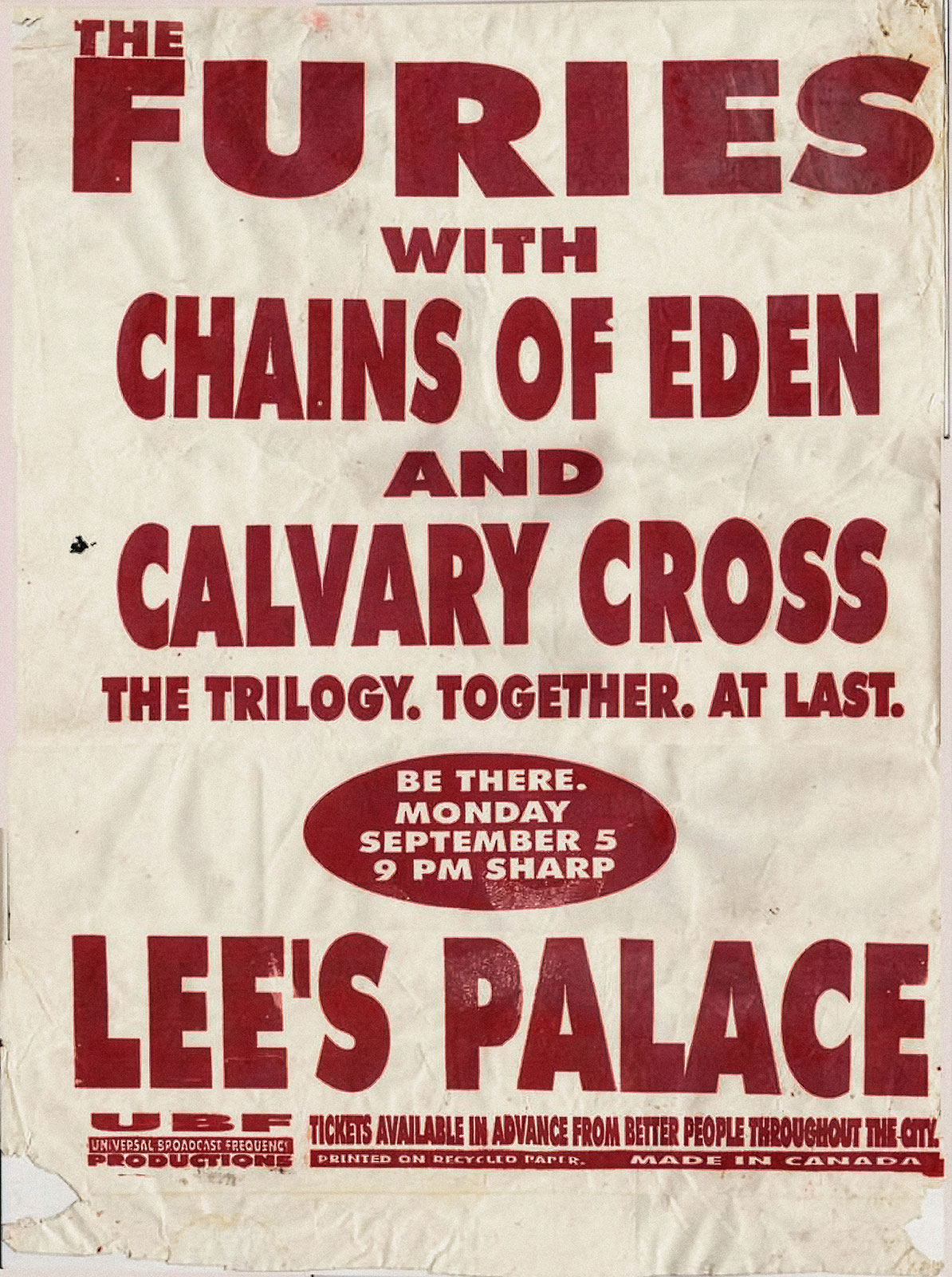 - live performance,The Furies, chains of eden,calvary cross, lee's palace, proto-goth band, Toronto 1986–1996